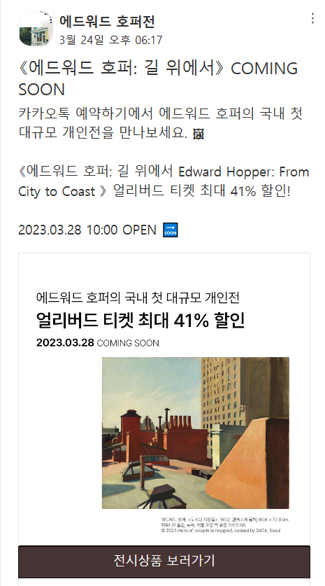에드워드호퍼(Edward Hopper) 전의 티켓가격은 성인기준 17,000원인데 현재 얼리버드티켓을 할인된 가격으로 구매가능합니다.  인터파크, 카카오톡, 29cm에서 판매중인데 현재 인터파크는 오픈된 표가 대부분 매진이고요. 카카오톡과 29cm에선 시간에 따라 표가 남아있습니다. 얼리버드할인 티켓은 4월 19일까지입니다. 놓치지말고 바로 예매하세요