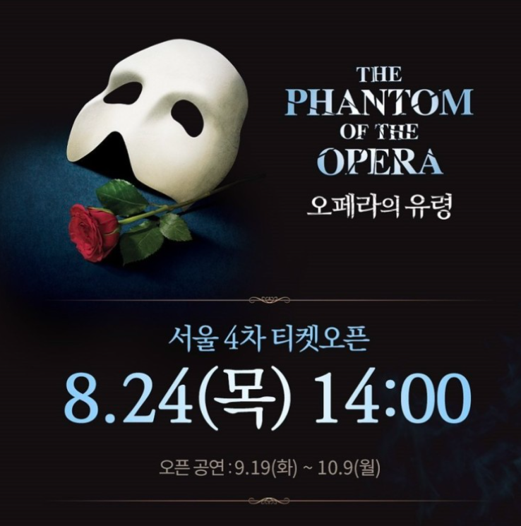 오페라의 유령 4차 티켓오픈은 8월 24일 목요일 오후 2시입니다. 오페라의 유령 4차 티켓오픈 공연기간은 9월 19일 화요일부터 10월 9일 월요일입니다. 오페라의 유령 공연예매를 기다리셨던 분이라면 일정확인하시고 알람설정해 놓은 뒤 8월 24일 오후 2시 오픈시간 놓치지 않길 바랍니다.