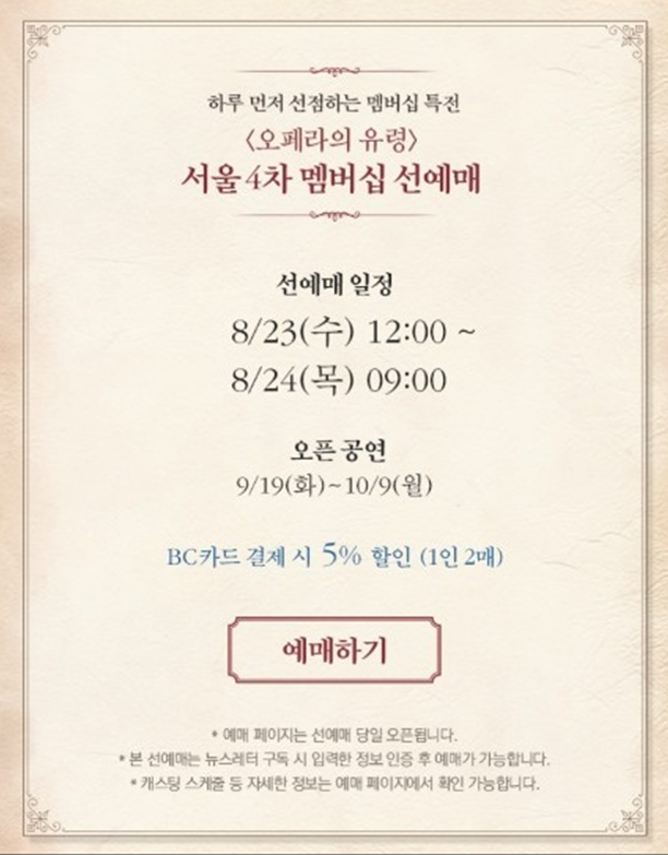 오페라의 유령 선예매는 일반예매 하루전날인 8월 23일 수요일 12시부터 8월 24일 목요일 오전 9시까지이며 VIP/R석에 한해 오픈합니다. 좋은 자리를 선점할 수 있고 좀 더 경쟁이 치열하지 않으니 선예매하시길 바랍니다. 선예매를 위해서는 뉴스레터 구독신청을 먼저 해야 자격이 주어져요. 뉴스레터 구독신청 후 선예매하시면 됩니다.