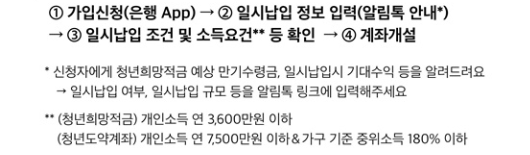 가입신청은 각 은행 앱을 통해 할 수 있고 알림톡 안내에 따라 일시납입 정보 입력를 입력한 후 일시납입 조건 및 소득요건 등을 확인하고 난 뒤 계좌개설이 가능합니다.