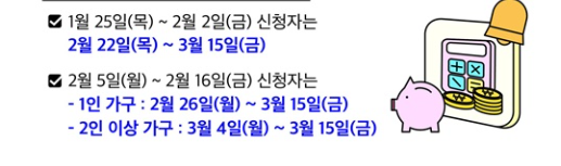 1월 25일(목) - 2월 2일(금) 신청자한 가입자는 2월 22일(목) ~ 3월 15일(금)사이 계좌계설이 가능하고 2월 5일(월)에서 2월 16일(금)사이 신청자는 1인 가구일 경우 2월 26일(월) ~ 3월 15일(금)까지 계좌개설 가능하고 2인 이상 가구는 3월 4일(월) ~ 3월 15일(금)까지 개설가능합니다.