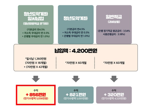 청년희망적금 만기수령금을 청년도약계좌에 일시납일 하여도 정부기여금도 한번에 매칭해 지급해 드립니다. 예를 들어 청년도약계좌를 개설해 1260만원을 일시 납입 하고 월 설정금액을 70만원으로 설정했다면 18개월간 70만원씩 일시납입한 것으로 인정해 추가 이자소득이 가능합니다.