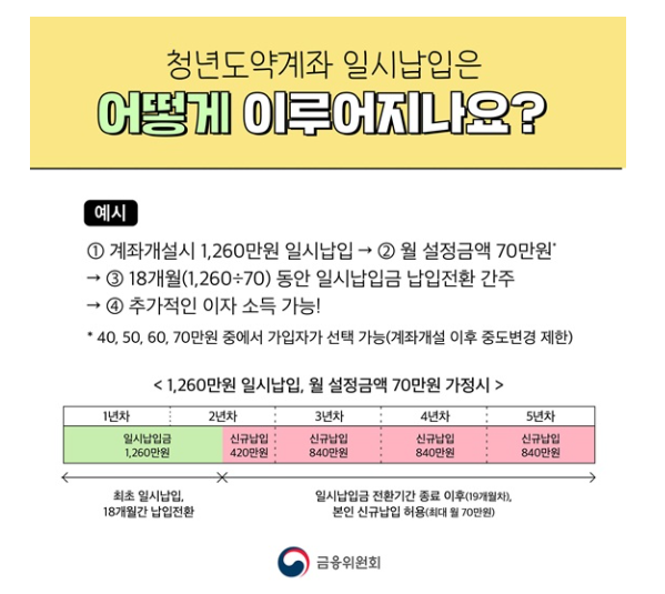 또 일시납입여부와 관계없이 청년도약계좌 만기는 5년으로 동일하며 연계가입 일정 이후에도 매월 가입신청이 가능합니다. 단 일시납입 신청은 3~4월까지만 가능하니 놓치지 마시길 바랍니다.