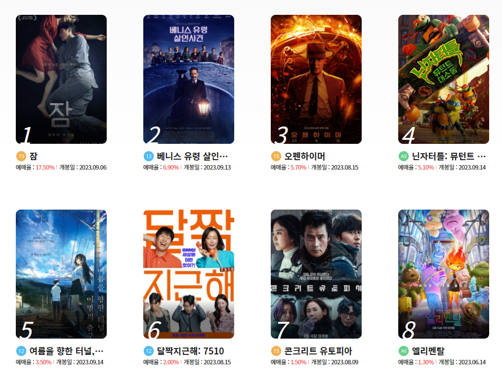 저는 영화 고를때 평점도 보고 고르는 편인데요. 지금 상영 중인 영화들 중 평점이 8점 이상인 작품은 일본 애니메이션 <여름을 향한 터널, 이별의 출구>와 개봉한지 3달이 되어가지만 여전히 인기 좋은 <엘리멘탈>로 아쉽게도 이 두 작품뿐이네요. 하지만 한국영화들이 영화순위에 많이 차지하고 있어 좋습니다.