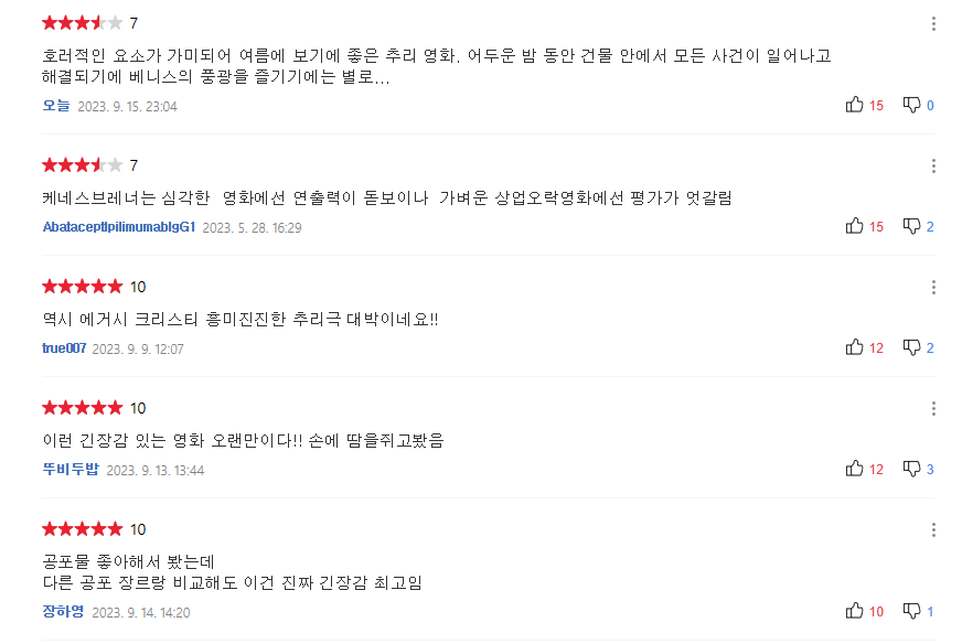긴장감 있게 잘 연출했다는 긍정적인 평과 영화가 반전이나 미스터리한 전개가 약하고 실망스럽다는 평도 있으나 평소 추리영화를 좋아하셨다면 관람해 보셔도 좋을 것 같습니다.