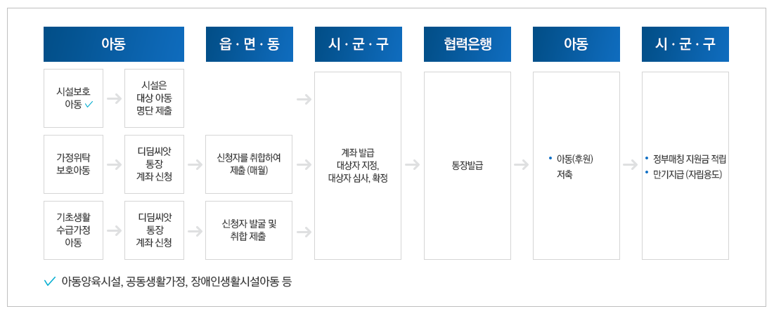 | 보호대상 아동 | 만 18세 미만의 아동복지시설 보호아동, 가정위탁 보호아동, 장애인거주시설 아동, 소년소녀가정 아동 |