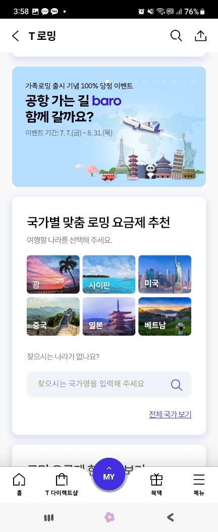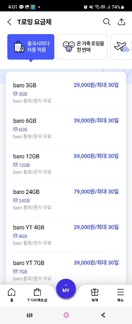 포켓와이파이는 충전을 해서 항상 가지고 다녀야 하는 번거로움이 있고 공항에서 찾고 반납하는 과정이 은근 번거롭기도 합니다. 해외에서 휴대폰 사용하는 세 가지 방법 중 오늘은 로밍을 통해 사용하는 방법으로 여러 통신사 중 SKT의 T로밍에 대해서 알려드리겠습니다. SKT통신사를 사용할 경우 로밍요금제는 T baro 요금제를 사용합니다.