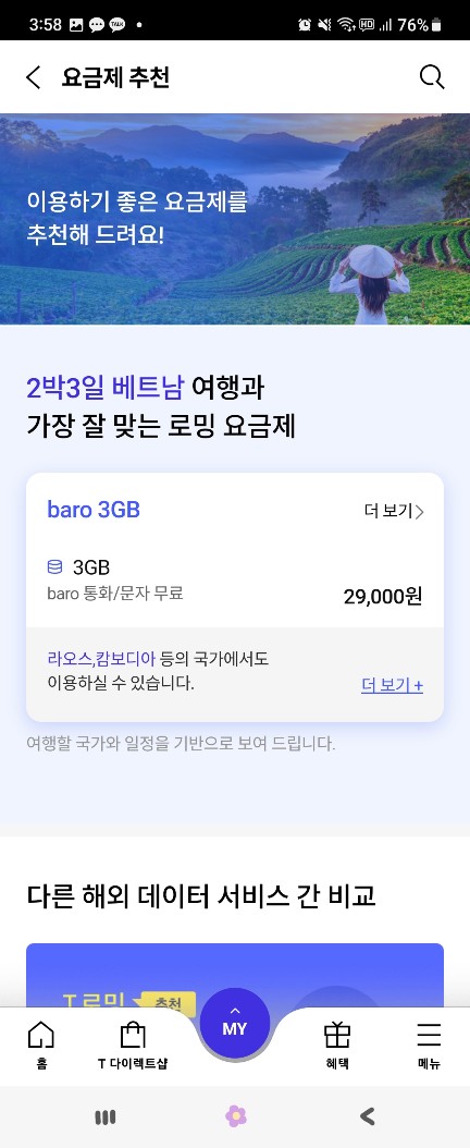 T로밍으로 들어가면 친절하게도 국가별 맞춤로밍 요금제를 추천해 줍니다. 전 제가 최근 이용했던 베트남 요금제를 선택해 보겠습니다.