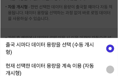 수동개시형은 출국할 때마다 데이터용량을 선택이용할 수 있고 자동개시형은 선택과정 없이 바로 로밍데이터를 사용할 수 있습니다. 자동개시형을 선택하면 해외에서 바로 로밍상태로 자동변환되기 때문에 편리합니다.