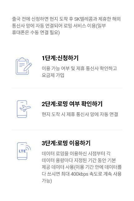 T 로밍은 요금의 데이터를 모두 소진했을 경우 400 kbps속도로 데이터를 사용할 수 있습니다. 휴대폰요금에서 이런 요금제를 사용해 보신 분은 아실 거예요. 데이터소진 후 내가 쓰는 데이터로 요금이 과징될까 걱정 없이 좀 느리지만 데이터를 사용할 수 있어 좋습니다.