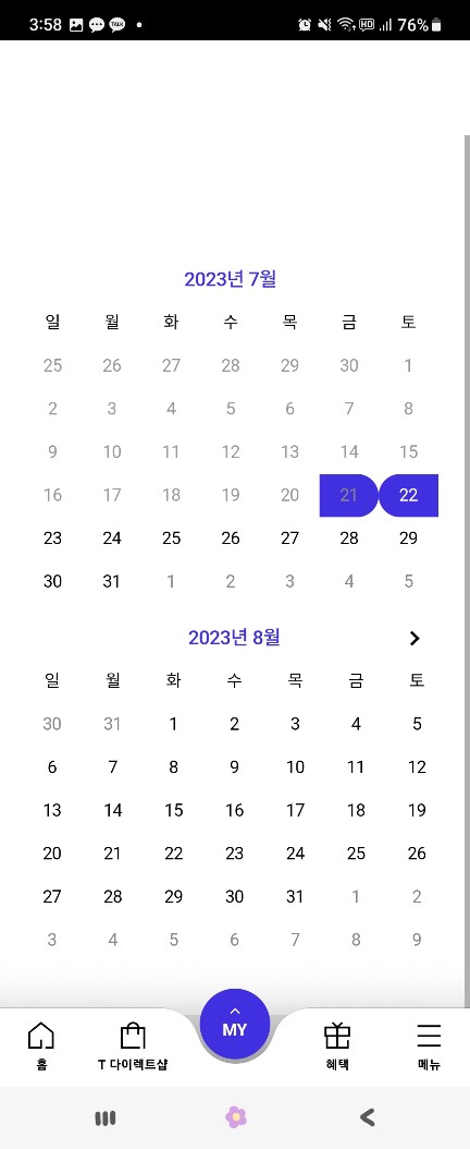 그럼 달력이 보이고 날짜를 선택할 수 있어요. 3박 4일을 선택해 추천요금제를 확인하면 3기가 29000원 요금제를 추천해 줍니다.