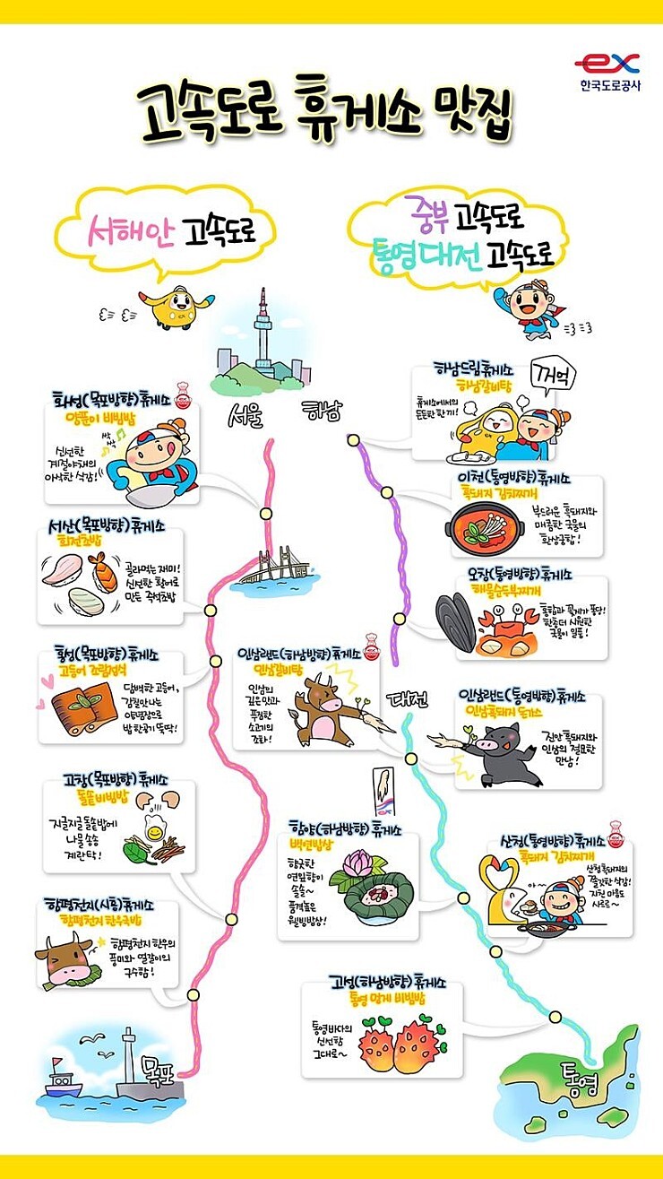 고속도로 휴게소는 더이상 맛없는 음식으로 허기를 채우는 곳이 아닌 그지역의 특별한 맛집을 경험할 수 있는 곳이 되었습니다. 내가 가는 휴게소와 일치하는 곳이 있다면 체크해 두셨다가 휴게소 맛집 들러보시기 바랍니다.