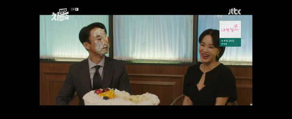 심상찮은 분위기속에 케이크를 나눠먹자고 하는 찰나 엄정화가 갑자기 서인호의 얼굴을 케이크에 퐉!!!! 박아버립니다.