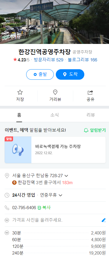 이용할 수 있는 공영주차장이 두군데 있는데 한남동 공영주차장이 거리상 더 멀긴 하지만 60분당 3000원으로 더 저렴하니 날씨가 좋아서 걸을만 하다면 한남동 공영주차장 이용을 추천드리고 금액보단 편한게 우선이라면 한강진역 공영주차장을 이용하시기 바랍니다.