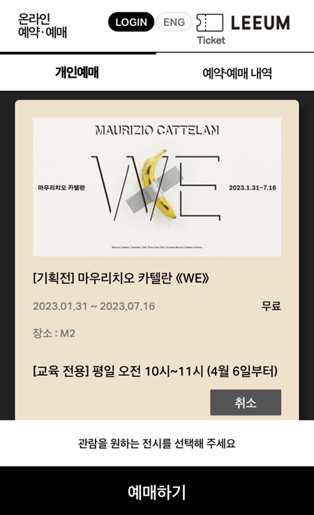 원래 3월까진 마우리치오전시가 워낙 인기가 많으니 다른 상설전시를 예매한 후 입장이 가능했는데 4월부터는 안됩니다. 반드시 마우리치오 전시로 예매를 해야 관람가능합니다.