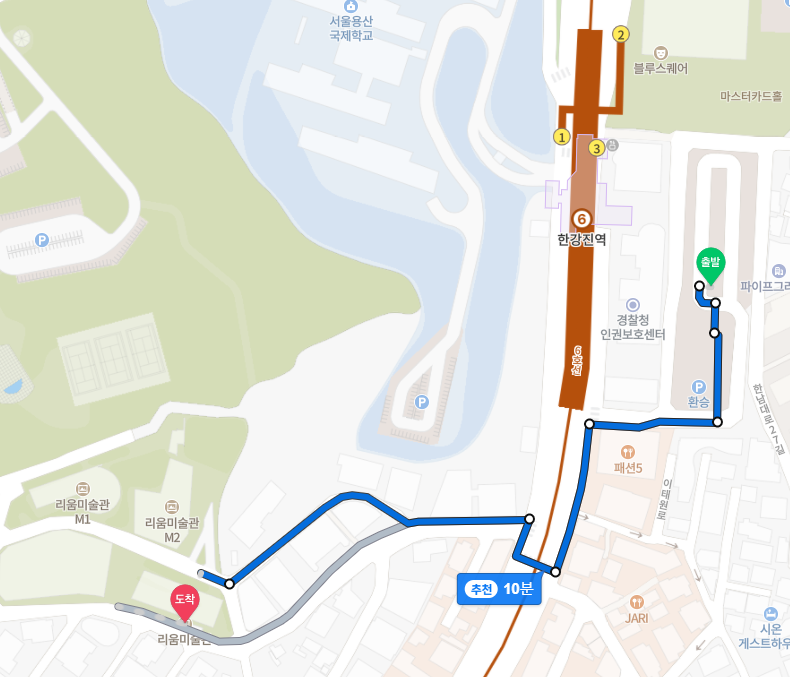 리움미술관은 한강진역만 찾으면 생각보다 걸어오기 편합니다. 한강진역 1번 출구에서 400미터정도 가면 되는데 중간중간 안내표지판이 잘 세워져 있고 가는길에 샵들 보는 재미도 있어 대중교통이용하기에 괜찮습니다.