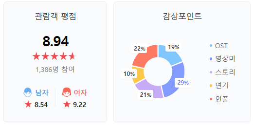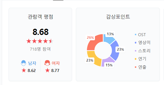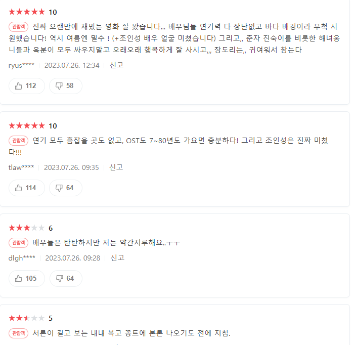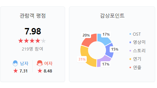 관람객 평점 : 관람객 평점은 7.98로 높지 않은편이며 감상평이 나뉘는 것 같습니다. 좋게 평가한 경우는 배우들 보는 재미는 있었다, 바다배경이 시원했다, 배우들의 액션신이 좋았다, 고민시의 연기가 좋았다 같은 평이 있었고 스토리가 루즈하고 지루했다는 평도 있으니 보시고 판단해 보면 될 것 같습니다.