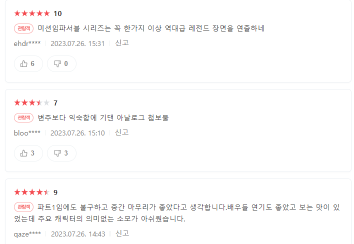 관객평점은 8.68로 미션임파서블의 아날로그액션에 찬사를 보내는 의견과 이번영화가 파트원이라 두 개로 나누느라 루즈하게 끌고 갔다는 의견으로 나뉘기도 했습니다.