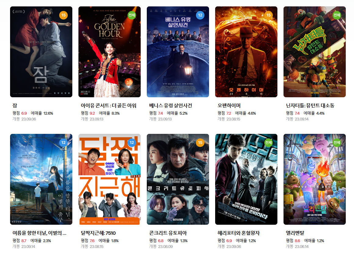 저는 영화 고를때 평점도 보고 고르는 편인데요. 지금 상영 중인 영화들 중 평점이 8점 이상인 작품은 일본 애니메이션 <여름을 향한 터널, 이별의 출구>와 개봉한지 3달이 되어가지만 여전히 인기 좋은 <엘리멘탈>로 아쉽게도 이 두 작품뿐이네요. 하지만 한국영화들이 영화순위에 많이 차지하고 있어 좋습니다.