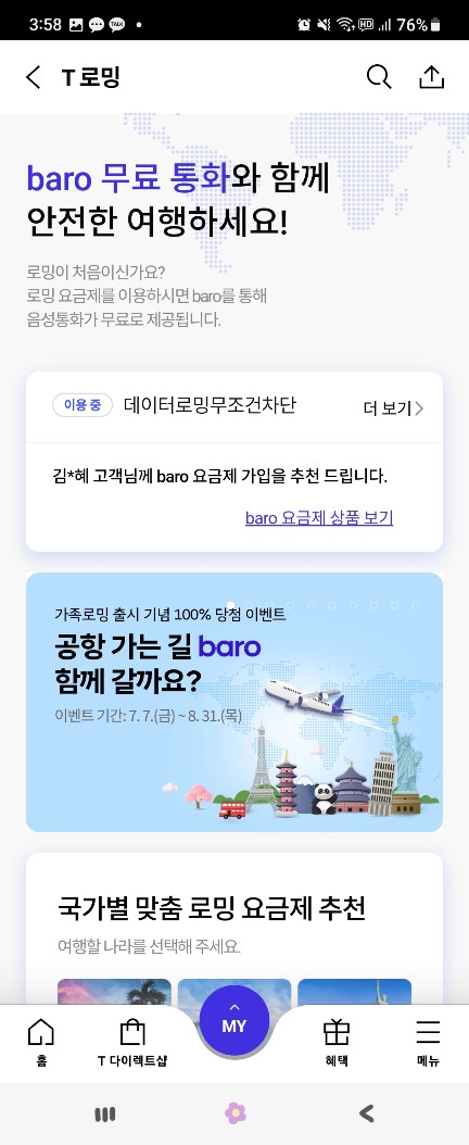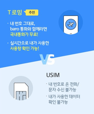 포켓와이파이는 충전을 해서 항상 가지고 다녀야 하는 번거로움이 있고 공항에서 찾고 반납하는 과정이 은근 번거롭기도 합니다. 해외에서 휴대폰 사용하는 세 가지 방법 중 오늘은 로밍을 통해 사용하는 방법으로 여러 통신사 중 SKT의 T로밍에 대해서 알려드리겠습니다. SKT통신사를 사용할 경우 로밍요금제는 T baro 요금제를 사용합니다.
