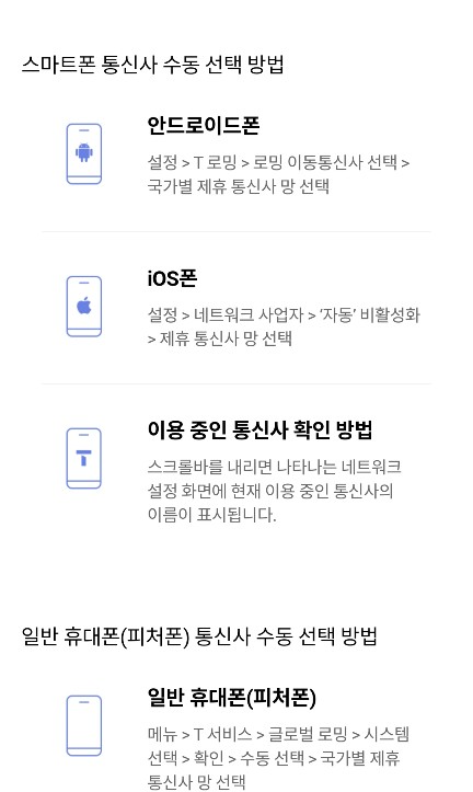 보통은 해외로 이동할 경우 자동으로 로밍이 연결됩니다. 단 자동 로밍이 안 되는 일부 휴대폰은 수동연결이 필요합니다.